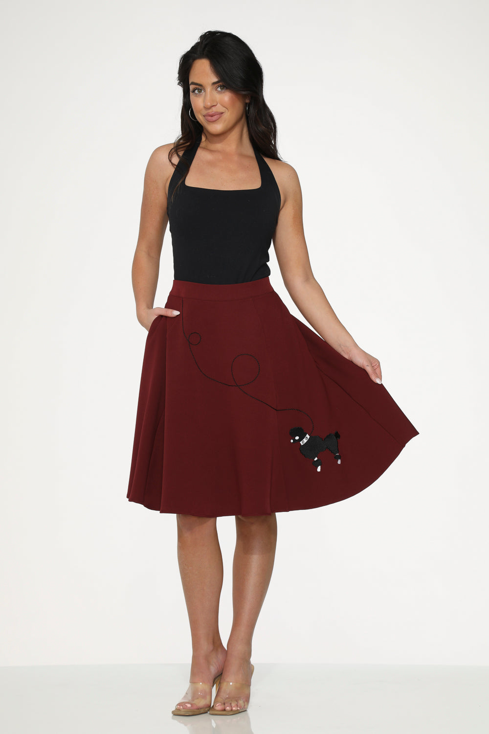 Turn heads and twirl with flair in the Orchid Bloom Burgundy & Black Embroidered Poodle Swing Skirt! With its deep burgundy hue and classic black poodle patch. this skirt is pure vintage charm with a bold twist. The flouncy silhouette and comfy stretch blend make it perfect for moonlit strolls. retro dances. or simply making every sidewalk your runway.