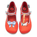 • Bold red printed fabric upper with playful split design: one shoe featuring a sweet blue bow. the other a daring axe detail