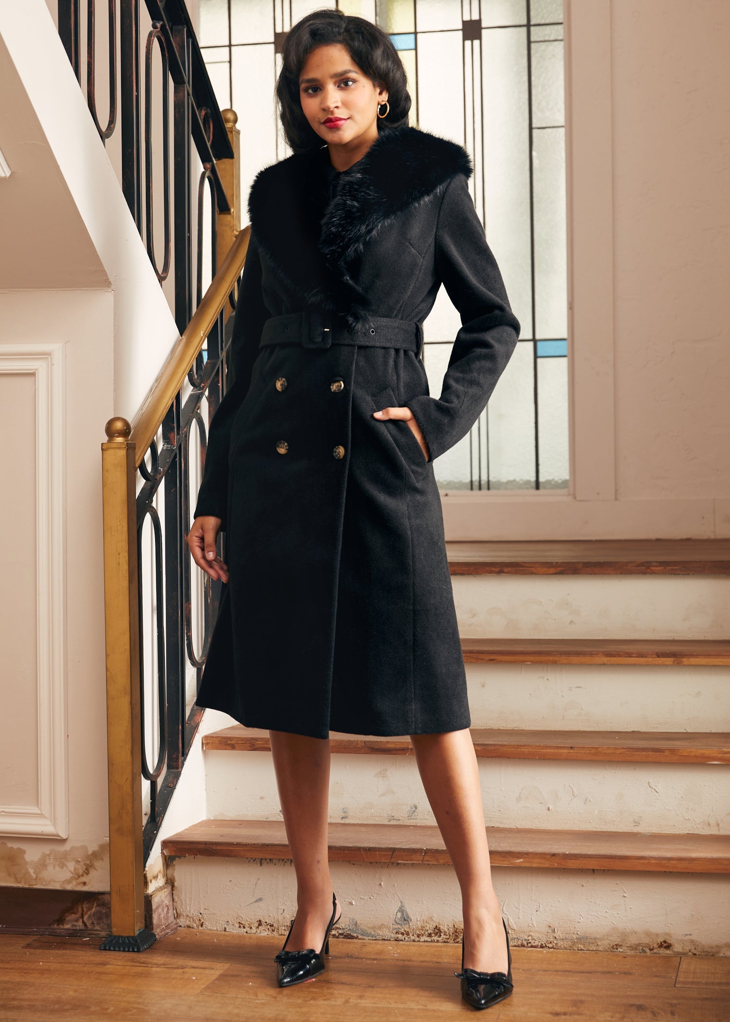 The Elegance Reimagined Fur Trim Coat. from our ModCloth namesake label. brings sophisticated drama to your winter wardrobe. In sleek eclipse noir. this woven coat dazzles with a luxurious faux fur trim and a flattering tie waist. With convenient pockets and elegant button details. it's the ideal outerwear for an evening gala or simply elevating your everyday style.